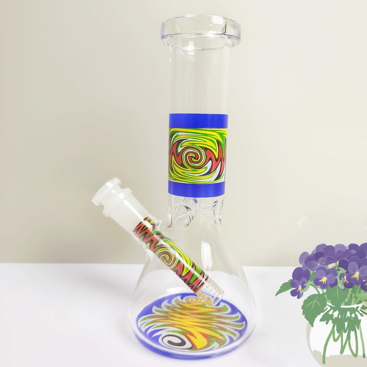This 8-inch beaker bong features vibrant wig-wag decals placed across the neck, base, and matching downstem, creating a lively, eye-catching design.