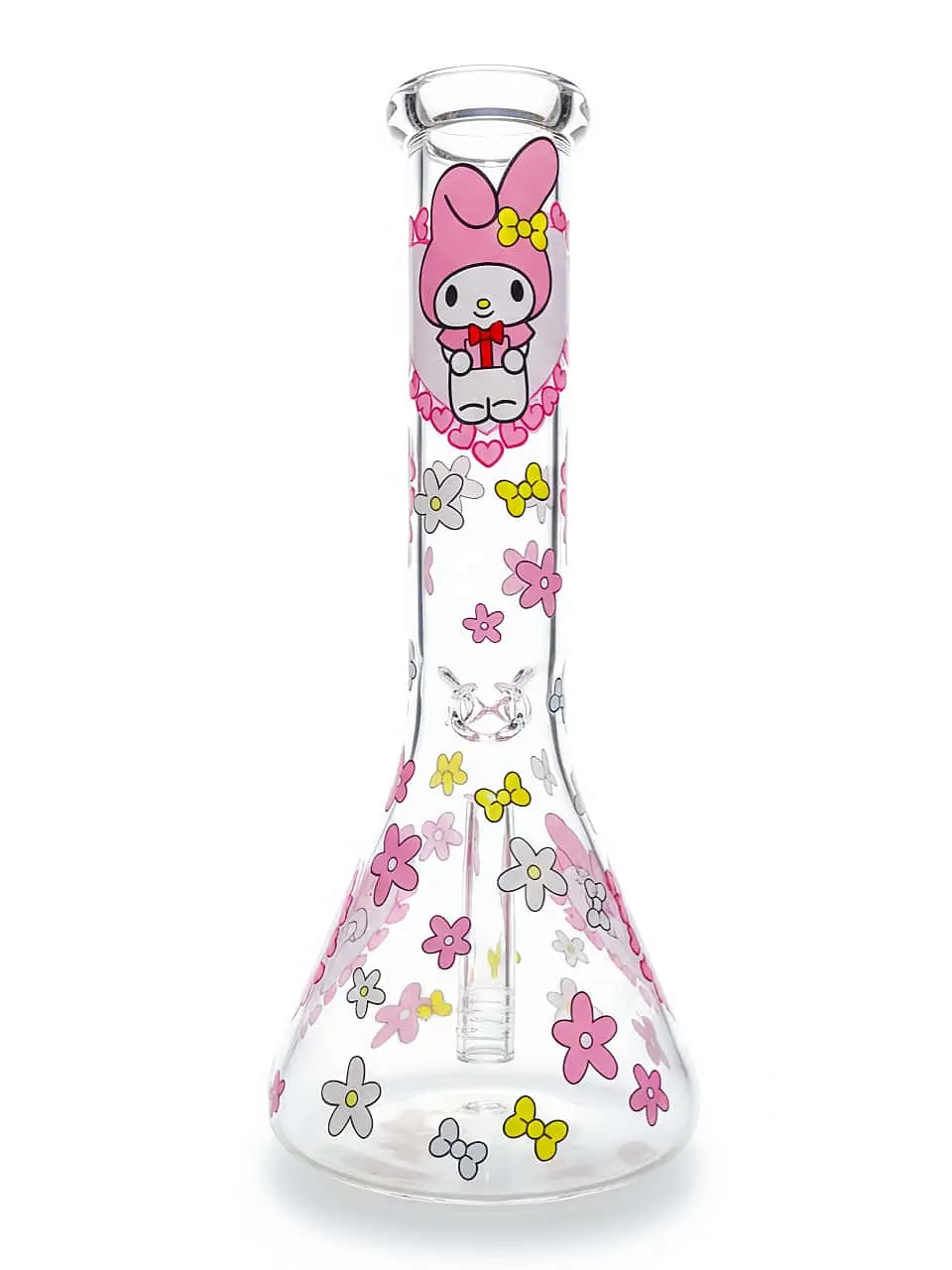 This My Melody-inspired beaker bong brings a touch of soft anime charm to your collection. Featuring a crystal-clear body adorned with cherry blossoms and sweet pastel accents, it perfectly captures the light, airy feeling of early spring. The classic beaker shape is paired with delicate pink details and tiny hearts, creating a look that is both sophisticated and incredibly cute.
