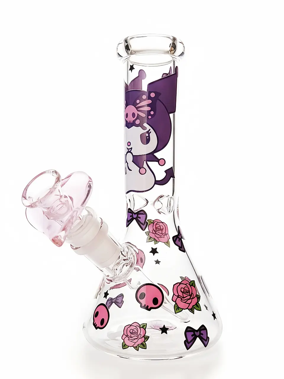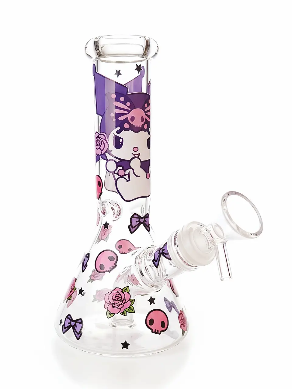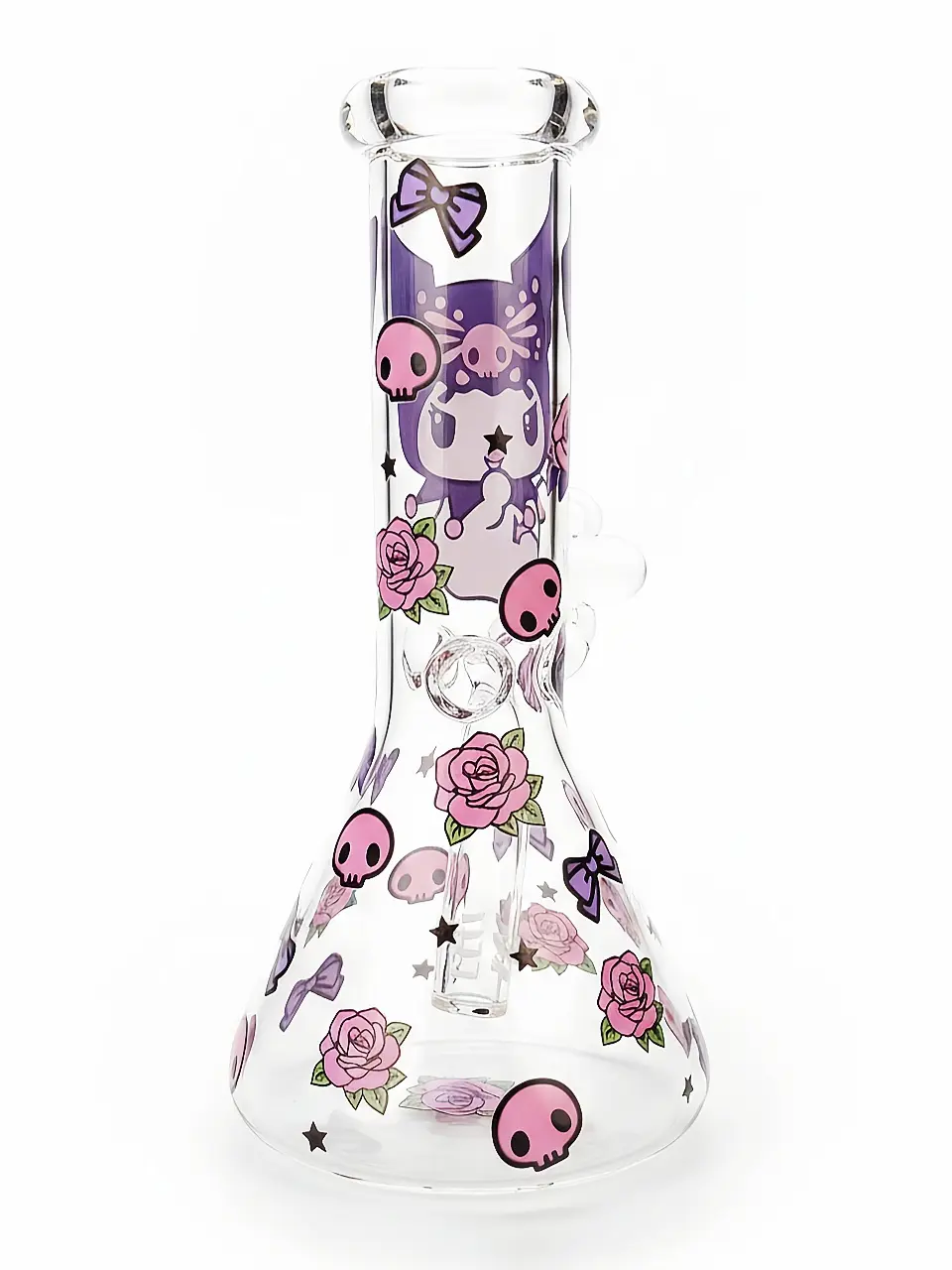 This Kuromi beaker bong brings bold dark-cute energy to your setup. Kuromi appears on the neck surrounded by pink skulls, purple roses, and gothic bows. The design blends sweet and rebellious elements, creating a playful goth kawaii aesthetic that stands out while still looking adorable on display.