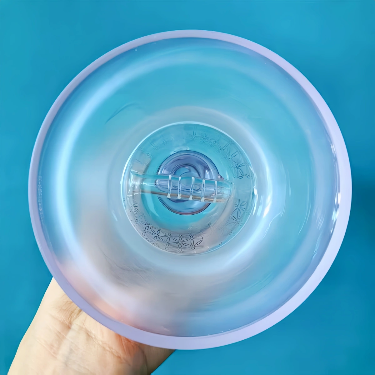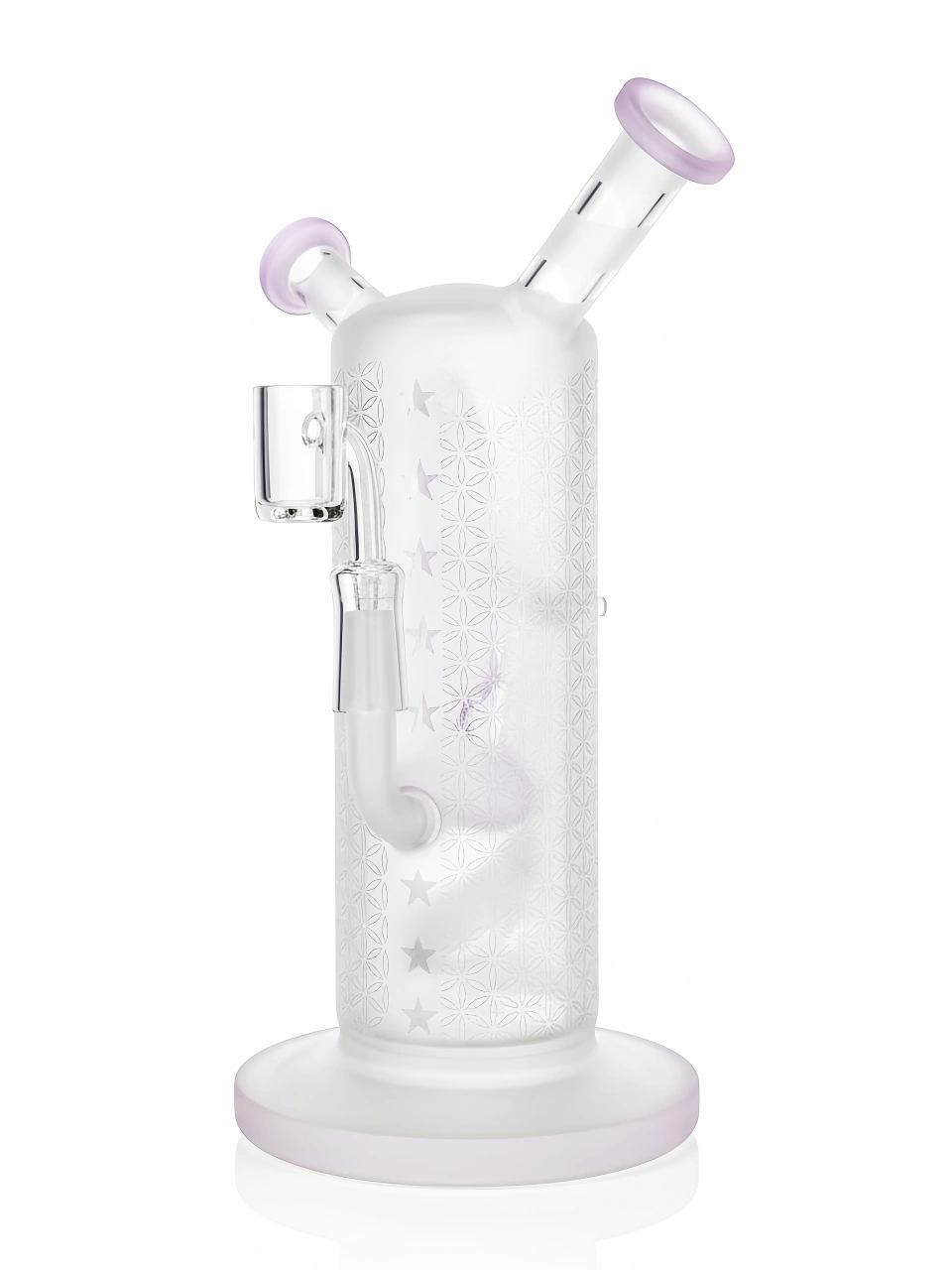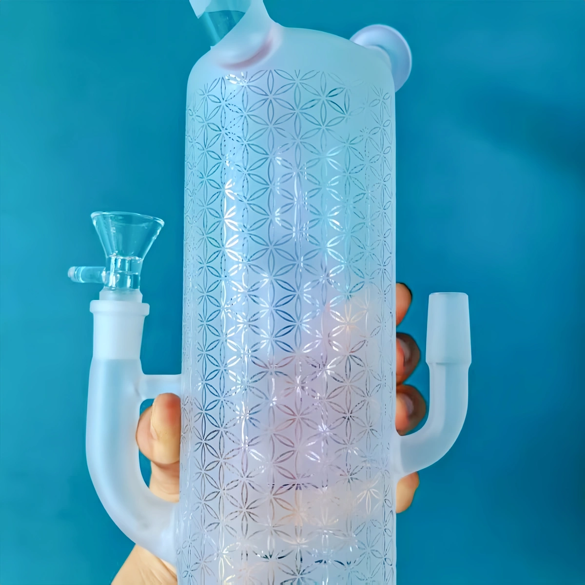 Crafted from thick borosilicate glass, this bong features a sleek cylindrical body with a soft frosted matte finish. The etched Seed of Life geometric patterns give it a clean, modern, and intentional look.