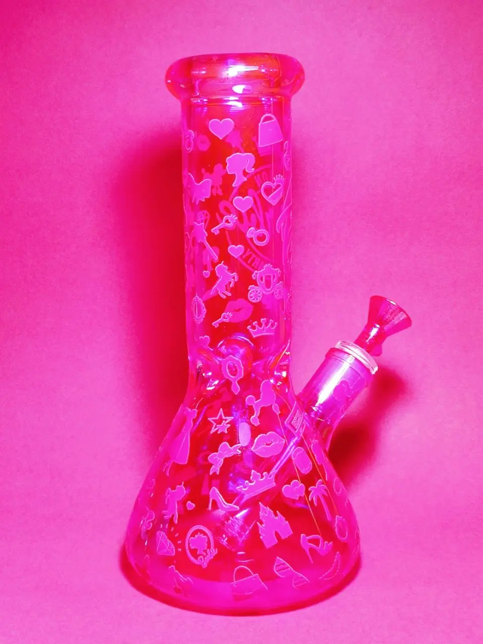 Stand out with this iridescent pink beaker bong that shimmers beautifully in the sunlight. The hot pink glass features a glamorous sparkle and a bold circle logo with iconic “Barbie” lettering that is instantly recognizable.