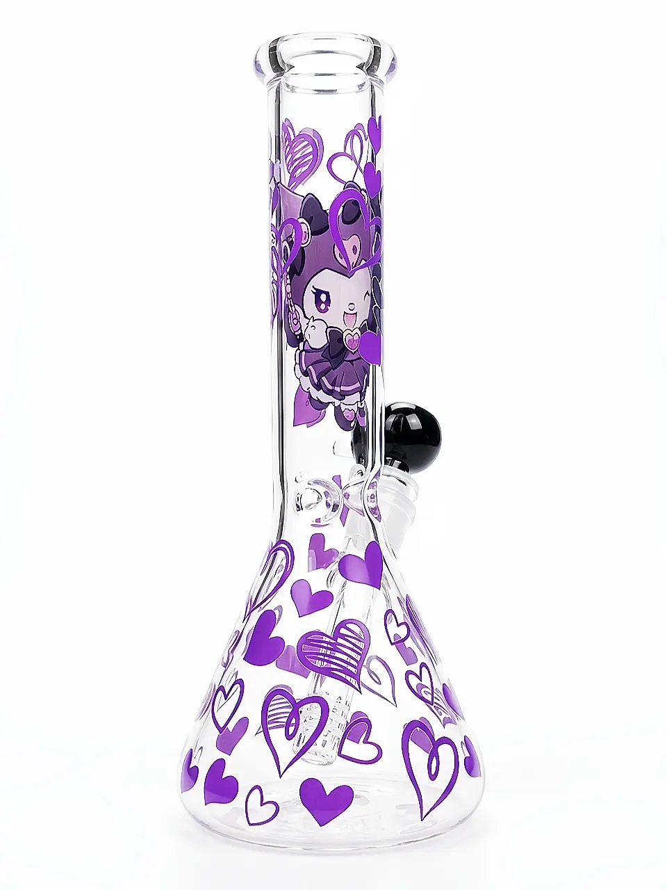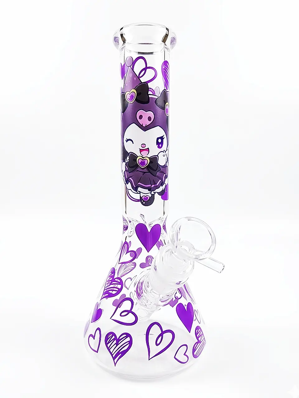 Bring some major attitude to your setup with this 10-inch Kuromi bong! This piece shows Kuromi in full party mode, wearing her iconic black hood and pink skull. Surrounded by purple bows, flowing ribbons, and sweet hearts, it perfectly captures the “edgy-meets-cute” look that Kuromi fans love.