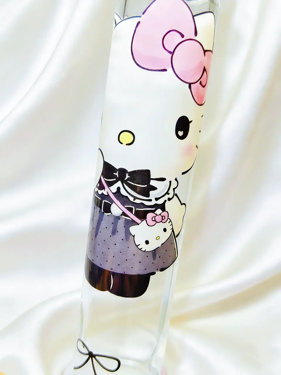 This piece is soft, elegant, and quietly stunning, featuring Hello Kitty reimagined as a sweet Lolita girl. Dressed in delicate black lace and polka dots with a blush pink bow, the design flows across the crystal-clear glass with floating petals and tiny hearts.