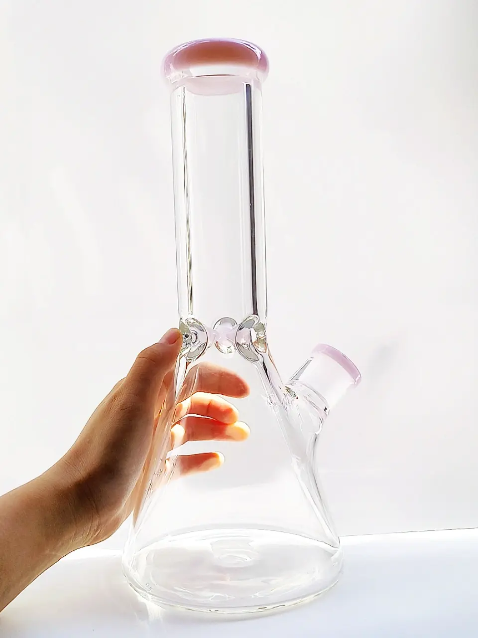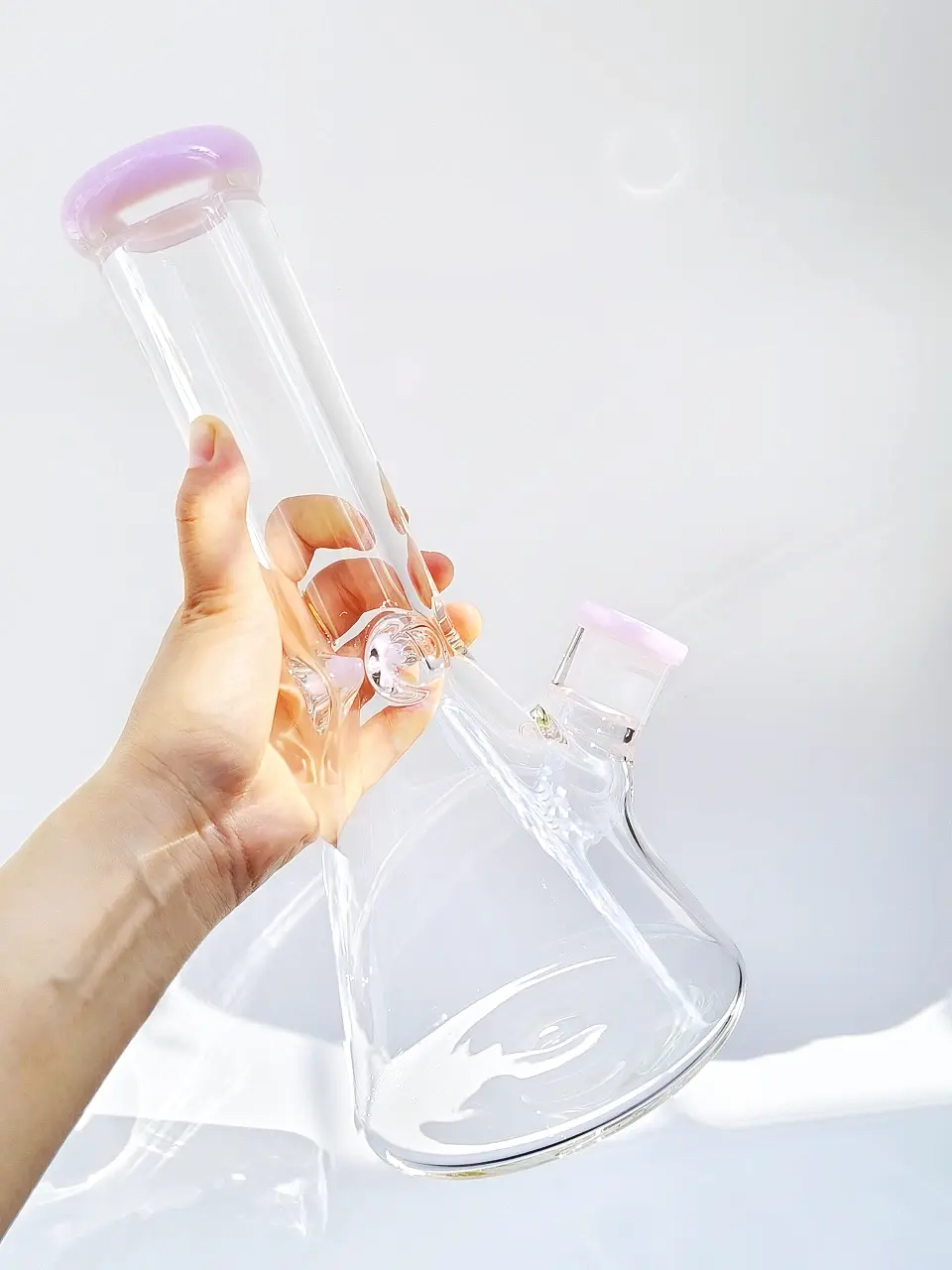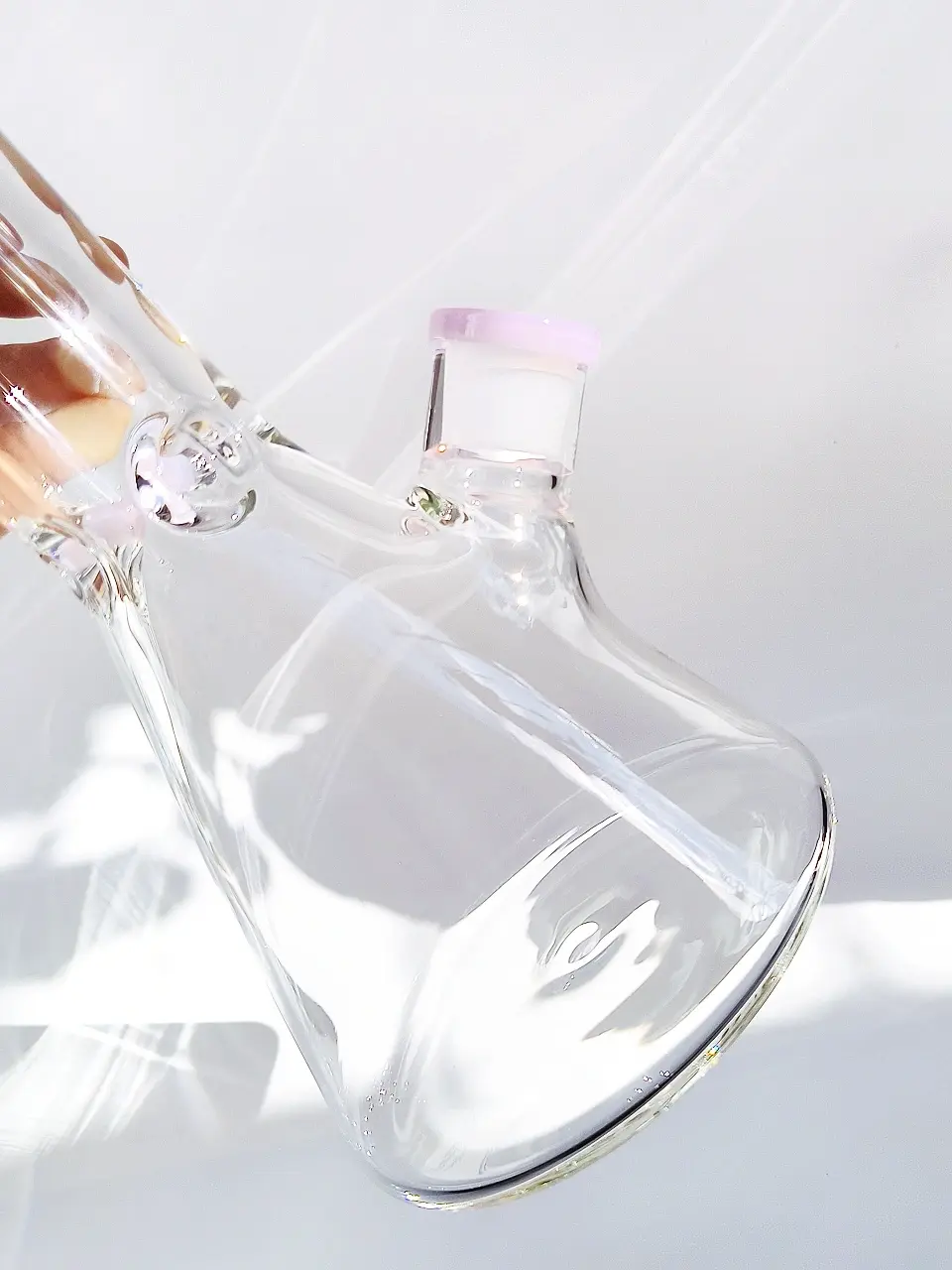 Keep it classic with a soft, feminine twist in this crystal-clear beaker bong. The sleek, transparent body is elevated by delicate pastel pink accents on the mouthpiece, joint, and ice pinch. It offers a clean and effortless silhouette that feels both incredibly sturdy and gracefully stylish, making it the perfect “quiet luxury” addition to any modern glass collection.