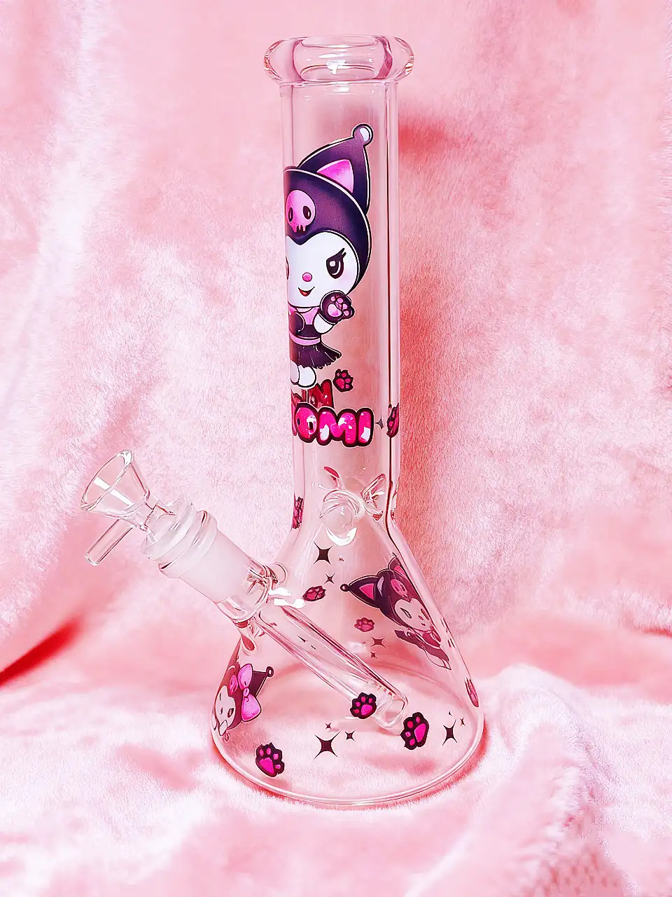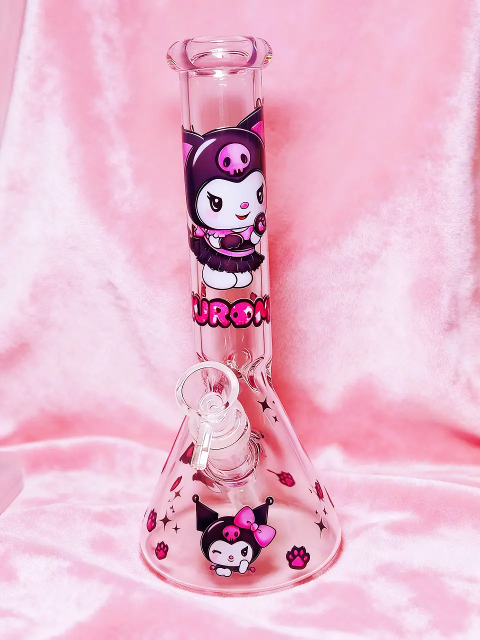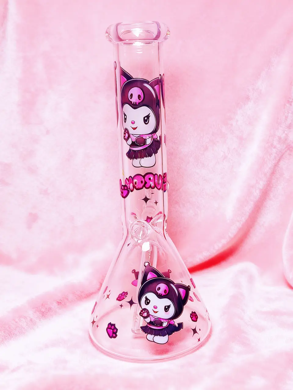 The clear glass body features a large “KUROMI” logo on the neck and playful pink paw prints scattered around the base. It is the ultimate combination of edgy style and sweet Sanrio magic, making it a standout addition to any glass collection.