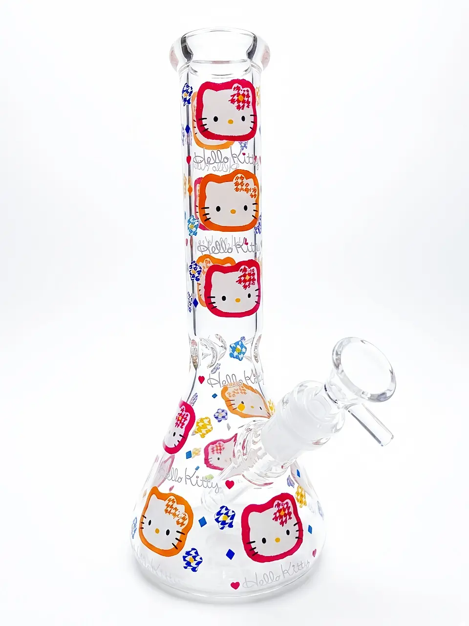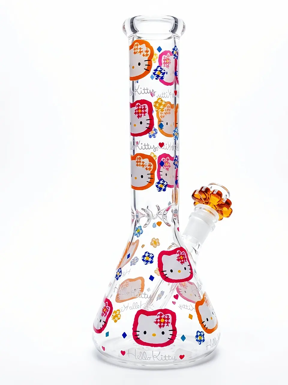 Step into a sugar-sweet world with this vibrant rainbow-bordered beaker bong. The crystal-clear glass features Hello Kitty framed in lively red, orange, and yellow tones, creating a dopamine-boosting visual feast.